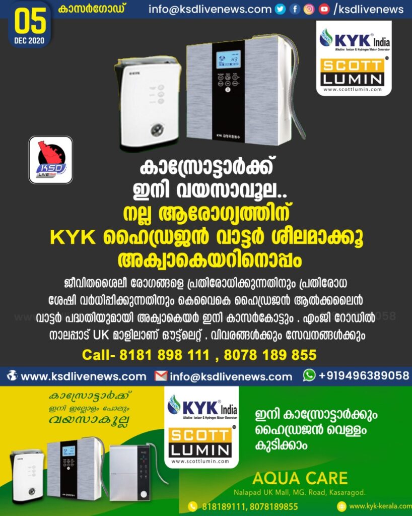 കാസ്രോട്ടാര്‍ക്ക് ഇനി വയസാവൂല.. നല്ല ആരോഗ്യത്തിന് KYK ഹൈഡ്രജന്‍ വാട്ടര്‍ ശീലമാക്കൂ അക്വാകെയറിനൊപ്പം