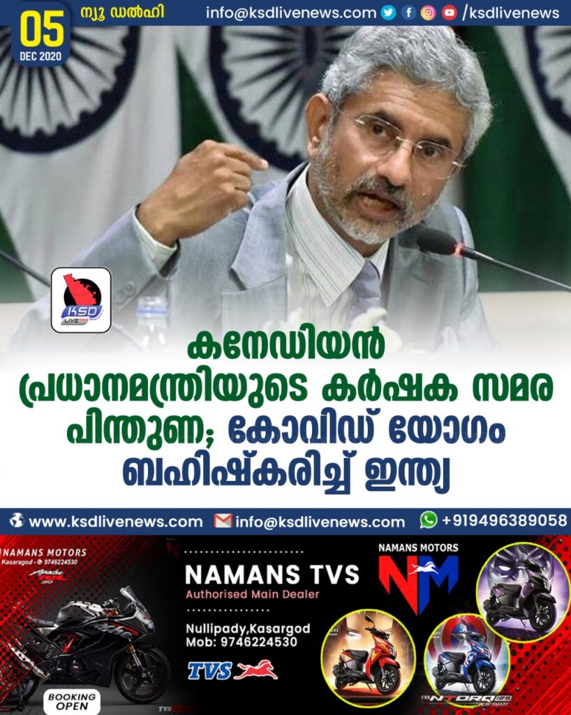 ഡൽഹി: ഡൽഹിയിൽ നടക്കുന്ന കർഷക സമരത്തിന് തുടർച്ചയായി പിന്തുണ പ്രഖ്യാപിച്ചുകൊണ്ട് കനേഡിയൻ പ്രധാനമന്ത്രി ജസ്റ്റിൻ ട്രൂഡോ രംഗത്തെത്തിയതിന് പിന്നാലെ കാനഡ വിദേശകാര്യ മന്ത്രി വിളിച്ച യോഗം ബഹിഷ്കരിച്ച് വിദേശകാര്യമന്ത്രി എസ്.ജയശങ്കർ.