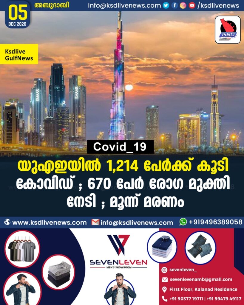 യുഎഇയില് 1,214 പേര്ക്ക് കൂടി കോവിഡ് ; 670 പേർ രോഗ മുക്തി നേടി ; മൂന്ന് മരണം