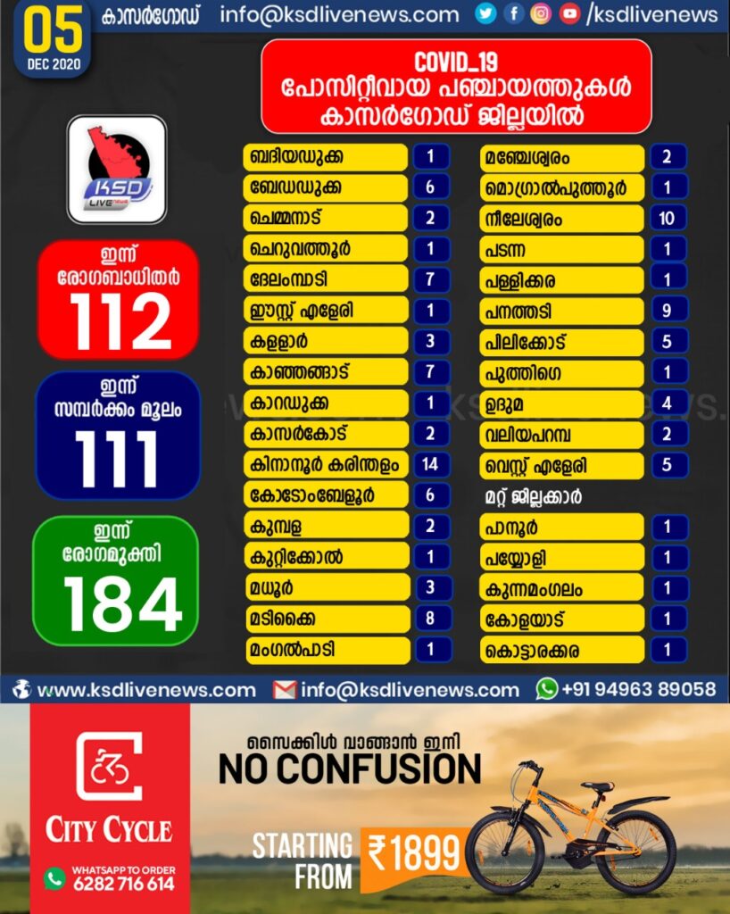 കാസർഗോഡ് ജില്ലയിൽ ഇന്ന് കോവിഡ് സ്ഥിരീകരിച്ചവരുടെ തദ്ദേശ സ്വയംഭരണ സ്ഥാപനം തിരിച്ചുള്ള കണക്ക്