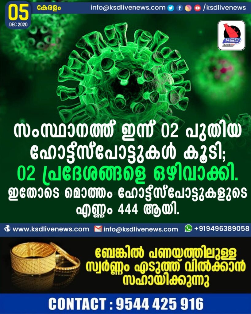 2 പ്രദേശങ്ങളെ ഹോട്ട് സ്പോട്ടില് നിന്നും ഒഴിവാക്കിയിട്ടുണ്ട്. ഇതോടെ ആകെ 444 ഹോട്ട് സ്പോട്ടുകളാണുള്ളത്.