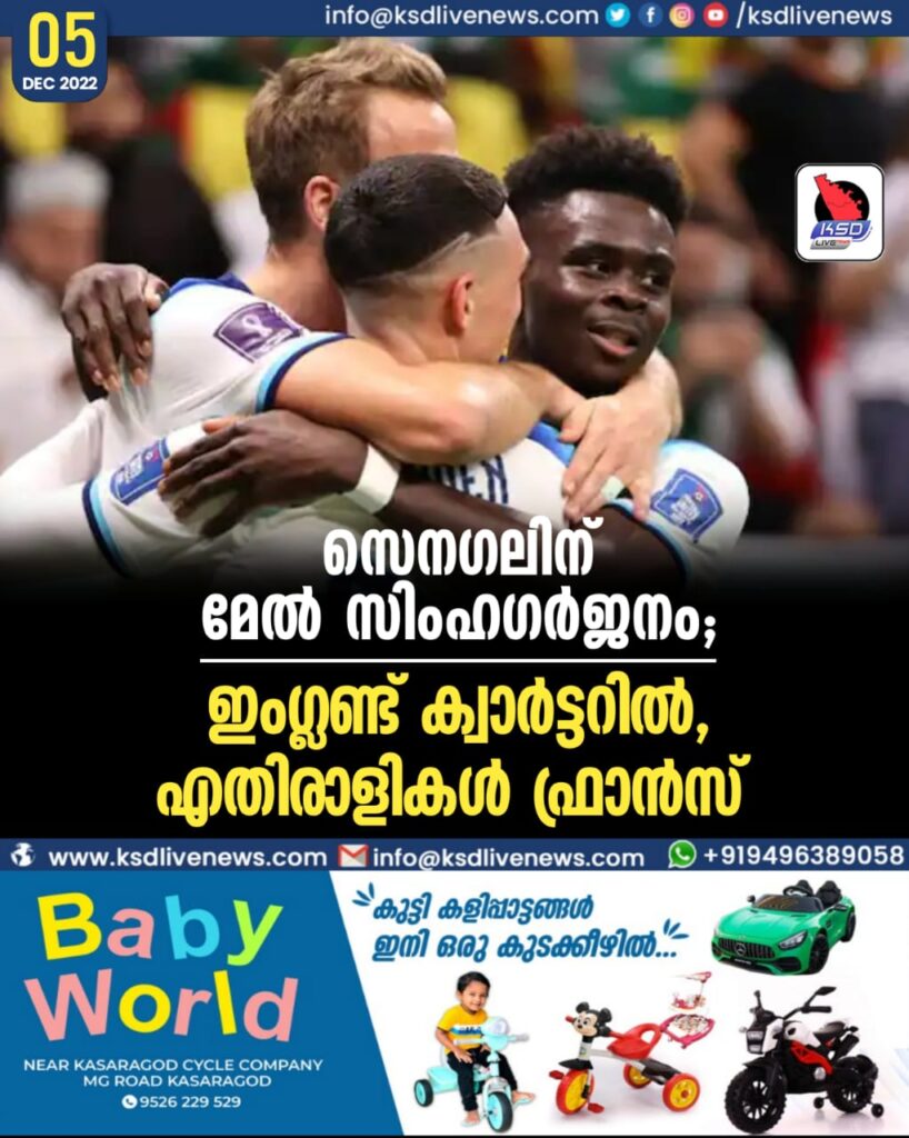 ദോഹ: ഖത്തർ ഫുട്ബോള്‍ ലോകകപ്പില്‍ പ്രീ ക്വാർട്ടറിനപ്പുറത്തേക്ക് അലിയോ സിസ്സെയുടെ സെനഗലിന്‍റെ അത്ഭുതങ്ങളില്ല. സെനഗലിനെ എതിരില്ലാത്ത മൂന്ന് ഗോളിന് തകർത്ത് ഇംഗ്ലണ്ട് ക്വാർട്ടറില്‍ പ്രവേശിച്ചു. ജോർദാന്‍ ഹെന്‍ഡേഴ്സണ്‍, ഹാരി കെയ്ന്‍, ബുക്കായോ സാക്ക എന്നിവരാണ് ഇംഗ്ലണ്ടിന്‍റെ സ്കോറർമാർ. ഇംഗ്ലീഷ് ആക്രമണത്തിന് മുന്നില്‍ പകച്ചുപോയ ആഫ്രിക്കന്‍ രാജാക്കന്‍മാർക്ക് ഇതോടെ ഖത്തറില്‍ നിന്ന് കണ്ണീർ മടക്കമായി. ക്വാർട്ടറില്‍ ഫ്രാന്‍സാണ് ഇംഗ്ലണ്ടിന് എതിരാളികള്‍.