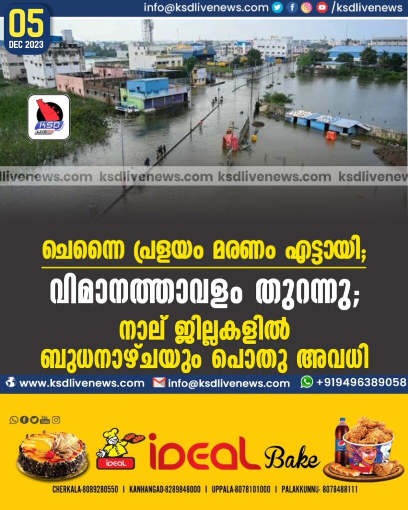ചെന്നൈ പ്രളയം: മരണം എട്ടായി, വിമാനത്താവളം തുറന്നു; നാല് ജില്ലകളിൽ ബുധനാഴ്ചയും പൊതു അവധി