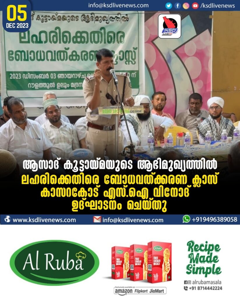ആസാദ് കൂട്ടായ്മയുടെ ആഭിമുഖ്യത്തിൽ ലഹരിക്കെതിരെ ബോധവത്ക്കരണ ക്ലാസ് കാസറകോട് എസ് ഐ വിനോദ് ഉദ്ഘാടനം ചെയ്തു