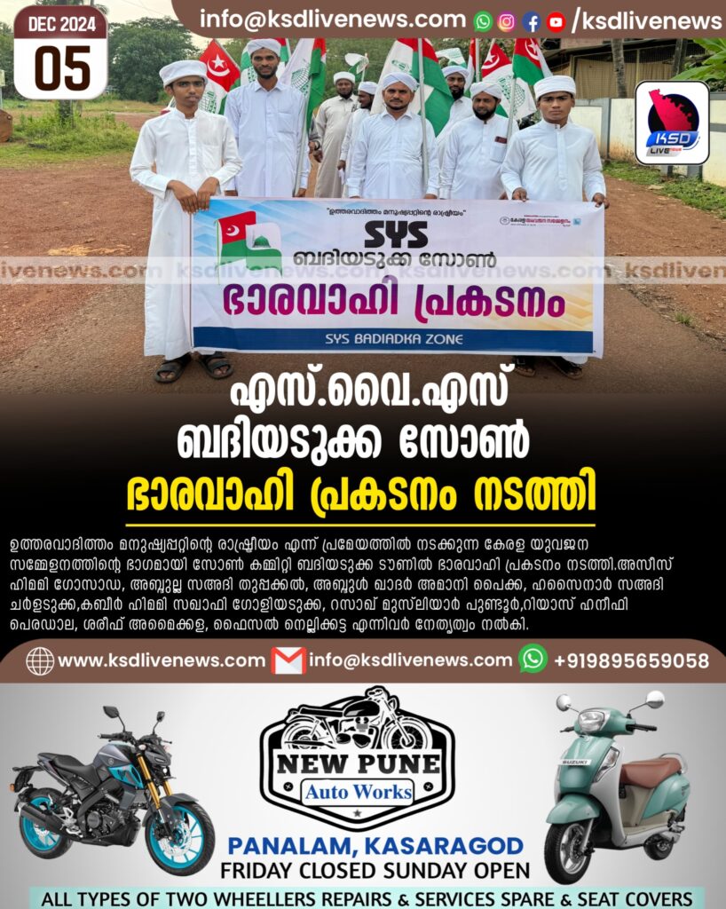 ബദിയടുക്ക: ഉത്തരവാദിത്തം മനുഷ്യപ്പറ്റിന്റെ രാഷ്ട്രീയം എന്ന് പ്രമേയത്തിൽ നടക്കുന്ന കേരള യുവജന സമ്മേളനത്തിന്റെ ഭാഗമായി സോൺ കമ്മിറ്റി ബദിയടുക്ക ടൗണിൽ ഭാരവാഹി പ്രകടനം നടത്തി.അസീസ് ഹിമമി ഗോസാഡ, അബ്ദുല്ല സഅദി തുപ്പക്കൽ, അബ്ദുൾ ഖാദർ അമാനി പൈക്ക, ഹസൈനാർ സഅദി ചർളടുക്ക,കബീർ ഹിമമി സഖാഫി ഗോളിയടുക്ക, റസാഖ് മുസ്‌ലിയാർ പുണ്ടൂർ,റിയാസ് ഹനീഫി പെരഡാല, ശരീഫ് അമൈക്കള, ഫൈസൽ നെല്ലിക്കട്ട എന്നിവർ നേതൃത്വം നൽകി.