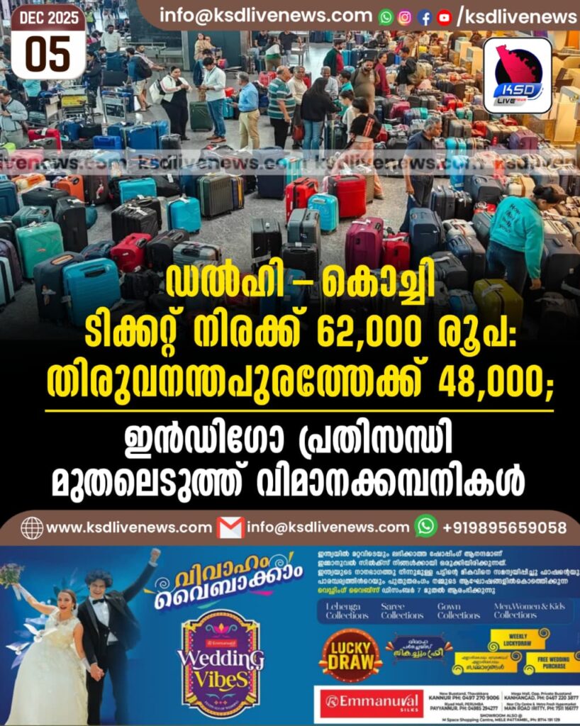 ഡൽഹി – കൊച്ചി ടിക്കറ്റ് നിരക്ക് 62,000 രൂപ, തിരുവനന്തപുരത്തേക്ക് 48,000; ഇൻഡിഗോ പ്രതിസന്ധി മുതലെടുത്ത് വിമാനക്കമ്പനികൾ