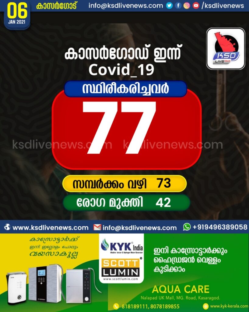 കാസര്കോട് ജില്ലയില് 77 പേര്ക്ക് കൂടി കോവിഡ്, 42 പേര്ക്ക് രോഗമുക്തി
