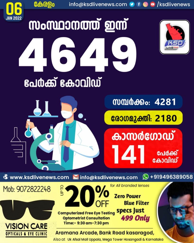 സംസ്ഥാനത്ത് ഇന്ന് 4649 പേർക്ക് കോവിഡ് സ്ഥിരീകരിച്ചു. സമ്പർക്കം വഴി 4281 പേർക്കും ; ആശ്വാസമായി 2180 പേർക്ക് രോഗ മുക്തിയും ; കാസർഗോഡ് ജില്ലയിൽ 141 പേർക്ക് പുതിയ കോവിഡ് കേസുകൾ ; മരണം 17