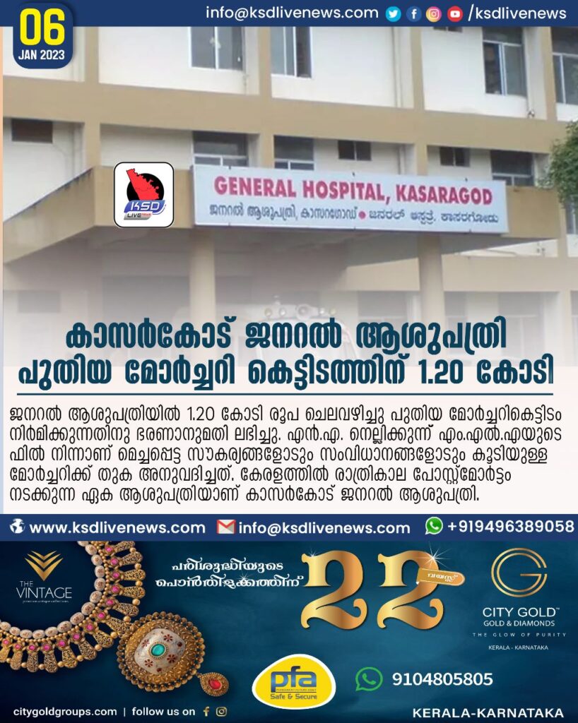 കാസർകോട് ജനറൽ ആശുപത്രി: പുതിയ മോർച്ചറി കെട്ടിടത്തിന് 1.20 കോടി