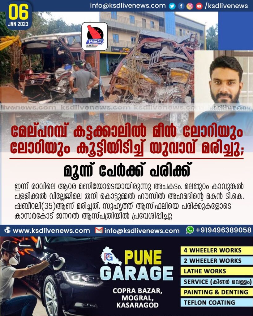 കാസര്‍കോട്: കെ.എസ്.ടി.പി റോഡില്‍ മേല്‍പ്പറമ്പ് കട്ടക്കാലില്‍ മീന്‍ ലോറിയും ബേക്കറി സാധനങ്ങള്‍ കൊണ്ടുപോവുകയായിരുന്ന മിനി ലോറിയും കൂട്ടിയിടിച്ച് മലപ്പുറം സ്വദേശിയായ യുവാവ് മരിച്ചു. സഹ ഡ്രൈവറായ സുഹൃത്തിനും മീന്‍ ലോറിയിലുണ്ടായിരുന്ന രണ്ടുപേര്‍ക്കും പരിക്കേറ്റു. ഇന്ന് രാവിലെ ആറര മണിയോടെയായിരുന്നു അപകടം. മലപ്പുറം കാവുങ്കല്‍ പള്ളിക്കല്‍ വില്ലേജിലെ തനി കൊട്ടുമ്മല്‍ ഹൗസില്‍ അഹമദിന്റെ മകന്‍ ടി.കെ. ഷബീറലി(35)ആണ് മരിച്ചത്. സുഹൃത്ത് ആസിഫലിയെ പരിക്കുകളോടെ കാസര്‍കോട് ജനറല്‍ ആസ്പത്രിയില്‍ പ്രവേശിപ്പിച്ചു.