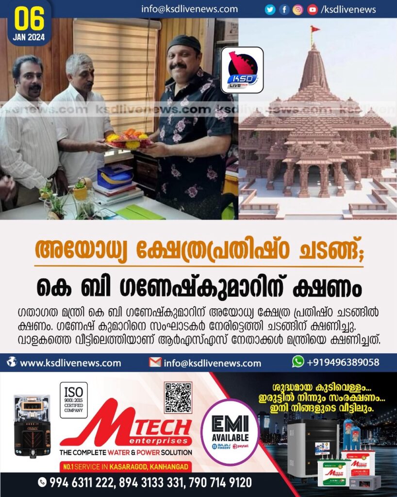 അയോധ്യ ക്ഷേത്രപ്രതിഷ്‌ഠ ചടങ്ങ്; കെ ബി ഗണേഷ്‌കുമാറിന് ക്ഷണം
