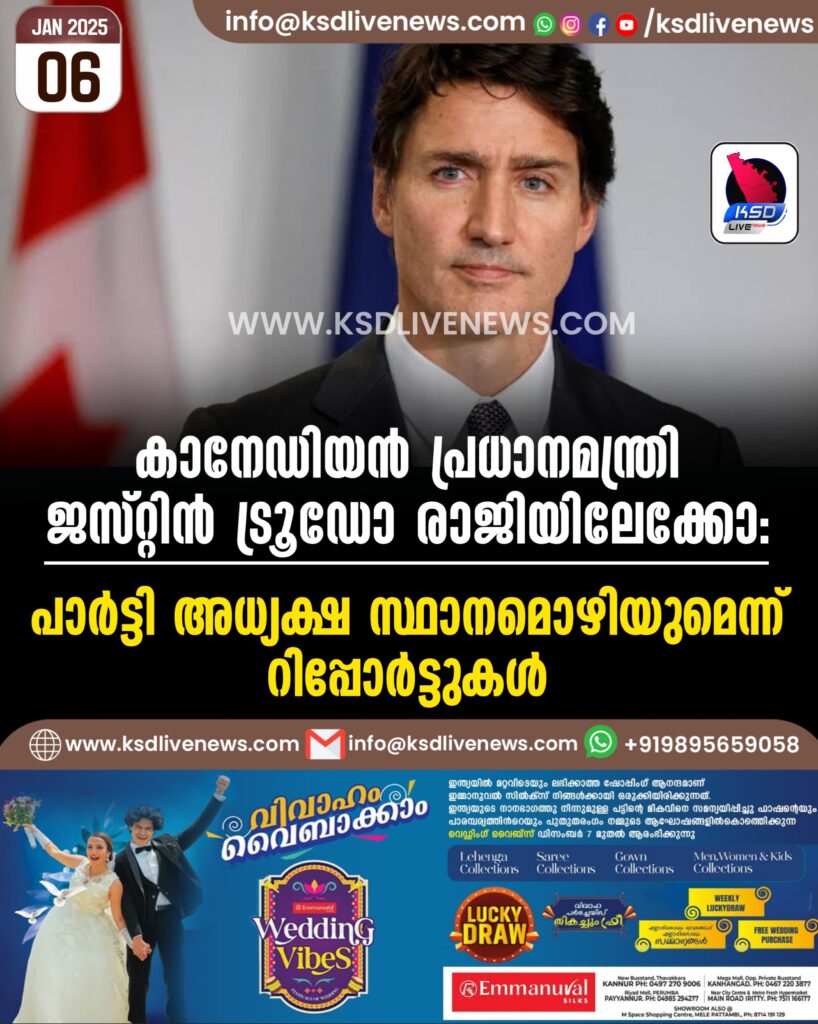 ഒട്ടാവ: കനേഡിയൻ പ്രധാനമന്ത്രി ജസ്റ്റിൻ ട്രൂഡോ ലിബറല് പാർട്ടിയുടെ തലപ്പത്ത് നിന്ന് സ്ഥാനമൊഴിഞ്ഞേക്കുമെന്ന് റിപ്പോർട്ടുകള്.