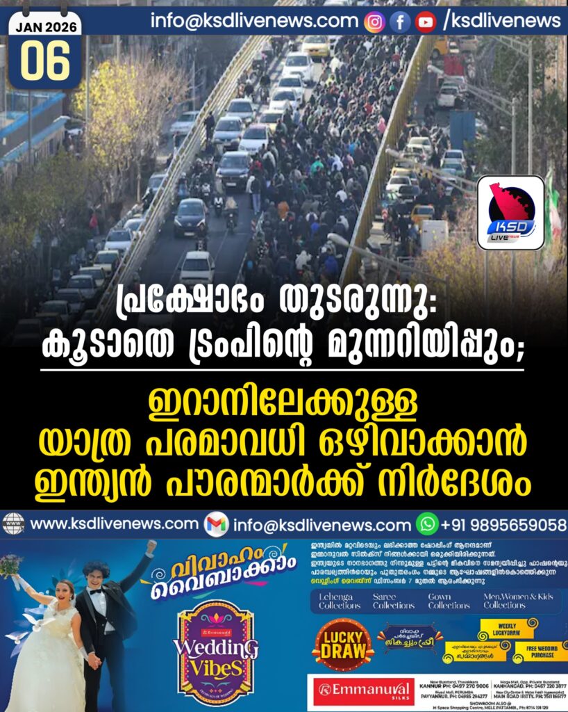 പ്രക്ഷോഭം തുടരുന്നു: കൂടാതെ ട്രംപിന്റെ മുന്നറിയിപ്പും; ഇറാനിലേക്കുള്ള യാത്ര പരമാവധി ഒഴിവാക്കാൻ ഇന്ത്യൻ പൗരന്മാർക്ക് നിർദേശം