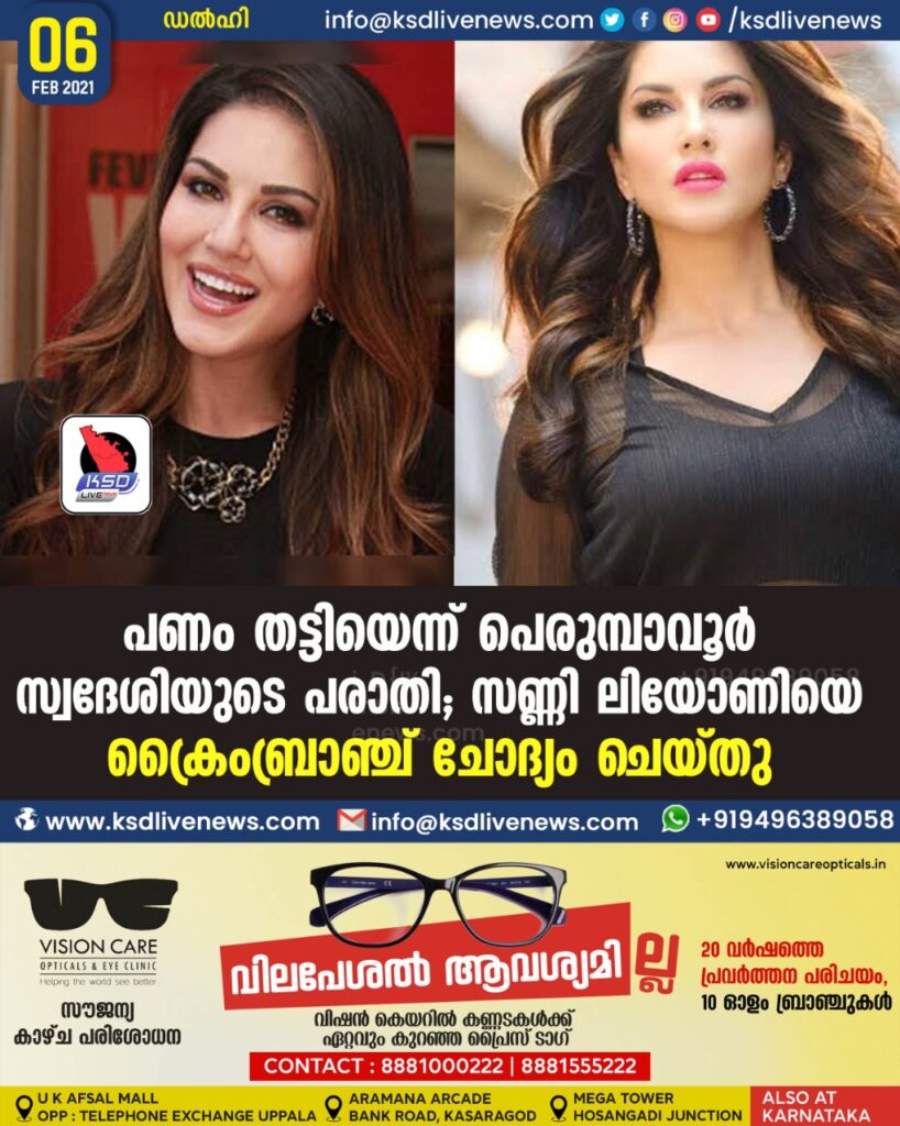 പണം തട്ടിയെന്ന് പെരുമ്പാവൂർ സ്വദേശിയുടെ പരാതി ; സണ്ണി ലിയോണിയെ ക്രൈംബ്രാഞ്ച് ചോദ്യം ചെയ്തു