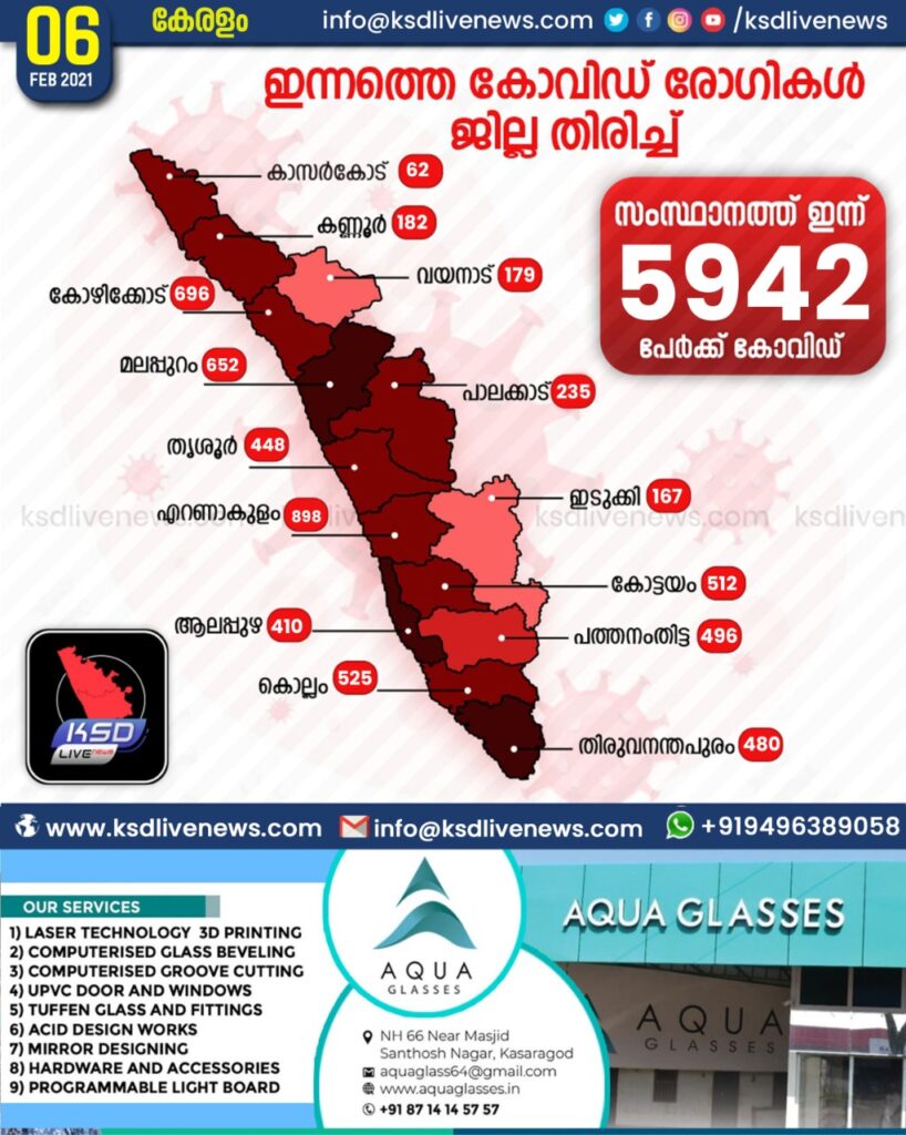കേരളത്തില് ഇന്ന് 5942 പേര്ക്ക് കോവിഡ്-19 സ്ഥിരീകരിച്ചു. എറണാകുളം 898, കോഴിക്കോട് 696, മലപ്പുറം 652, കൊല്ലം 525, കോട്ടയം 512, പത്തനംതിട്ട 496, തിരുവനന്തപുരം 480, തൃശൂര് 448, ആലപ്പുഴ 410, പാലക്കാട് 235, കണ്ണൂര് 182, വയനാട് 179, ഇടുക്കി 167, കാസര്ഗോഡ് 62 എന്നിങ്ങനേയാണ് ജില്ലകളില് ഇന്ന് രോഗ ബാധ സ്ഥിരീകരിച്ചത്.