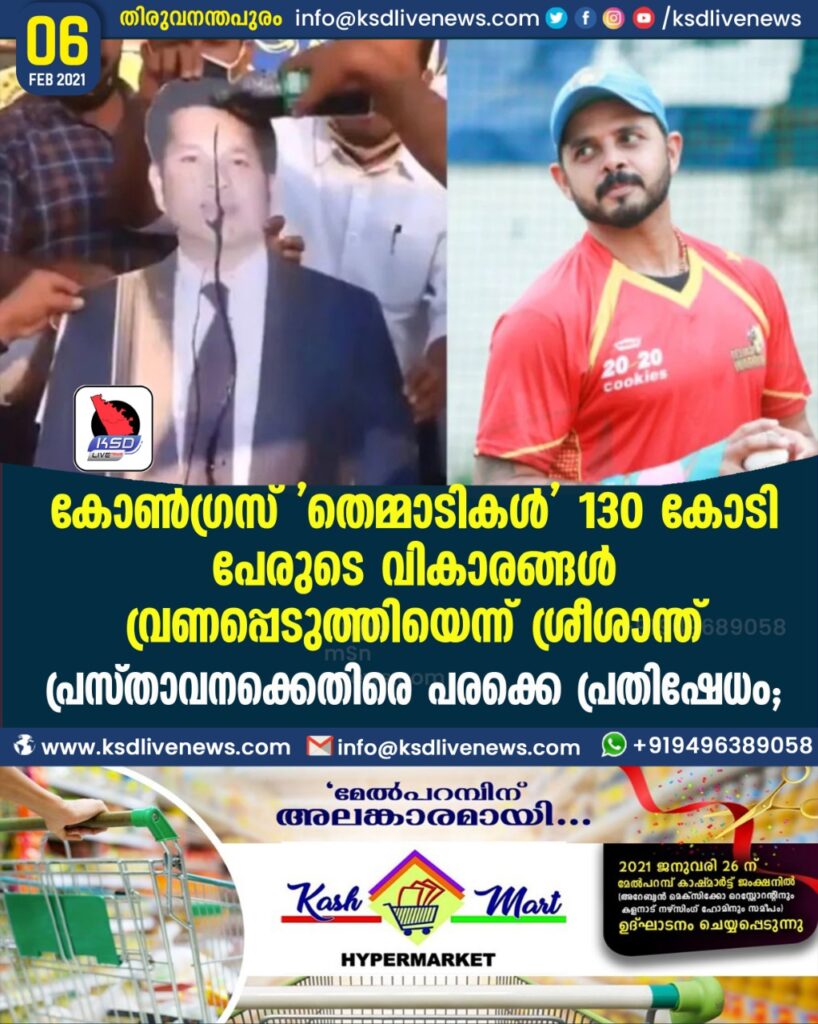 കോണ്‍ഗ്രസ് ‘തെമ്മാടികള്‍’ 130 കോടി പേരുടെ വികാരങ്ങള്‍ വ്രണപ്പെടുത്തിയെന്ന് ശ്രീശാന്ത്