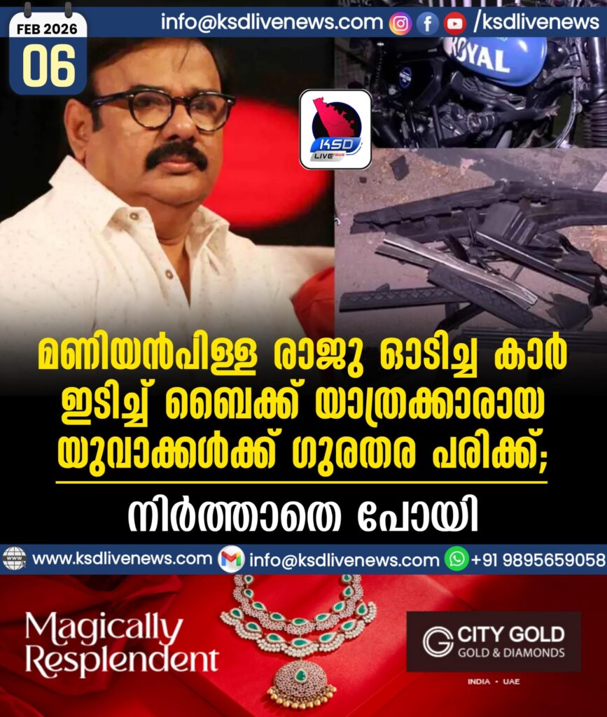 മണിയൻപിള്ള രാജു ഓടിച്ച കാർ ഇടിച്ച് ബൈക്ക് യാത്രക്കാരായ യുവാക്കൾക്ക് ഗുരതര പരിക്ക്; നിർത്താതെ പോയി