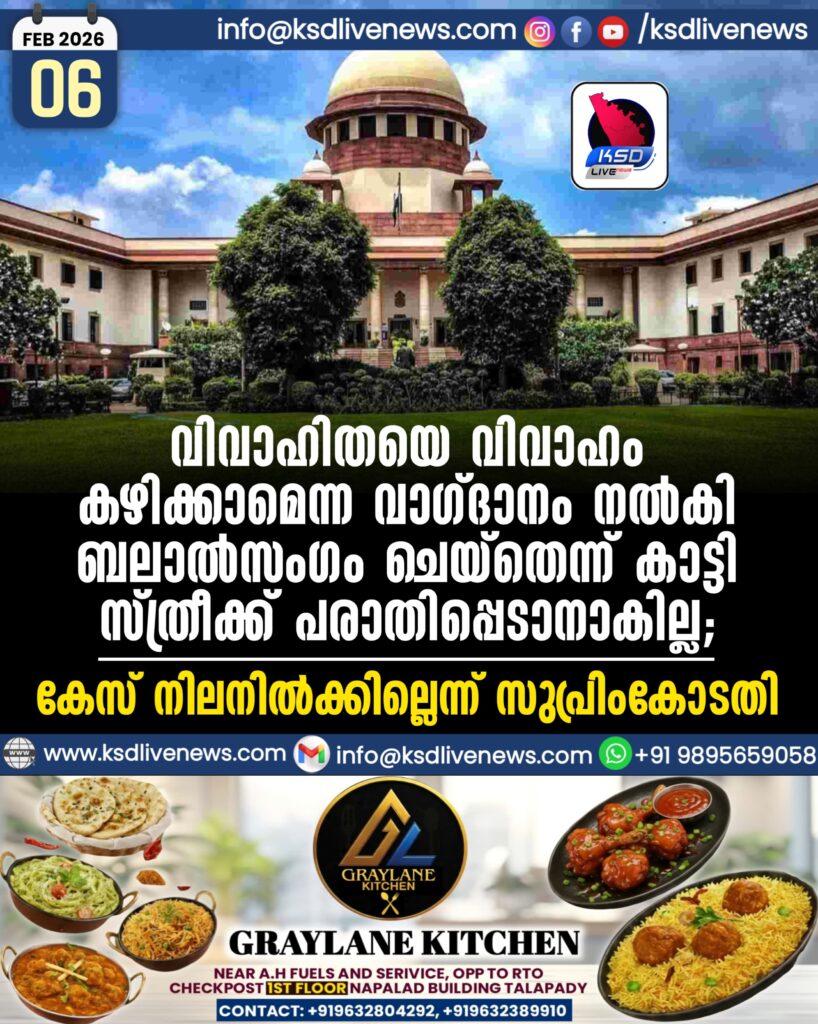 വിവാഹിതയെ വിവാഹം കഴിക്കാമെന്ന വാഗ്ദാനം നല്കി ബലാല്സംഗം ചെയ്തെന്ന് കാട്ടി സ്ത്രീക്ക് പരാതിപ്പെടാനാകില്ല; കേസ് നിലനില്ക്കില്ലെന്ന് സുപ്രിംകോടതി