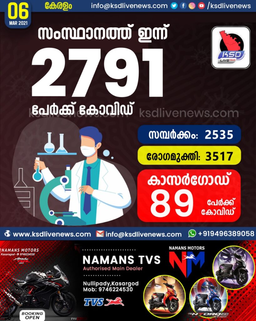 സംസ്ഥാനത്ത് ഇന്ന് 2791 പേർക്ക് കോവിഡ് സ്ഥിരീകരിച്ചു. സമ്പർക്കം വഴി 2535 പേർക്കും ; ആശ്വാസമായി 3517 പേർക്ക് രോഗ മുക്തിയും ; കാസർഗോഡ് ജില്ലയിൽ 89 പേർക്ക് പുതിയ കോവിഡ് കേസുകൾ ; മരണം 16