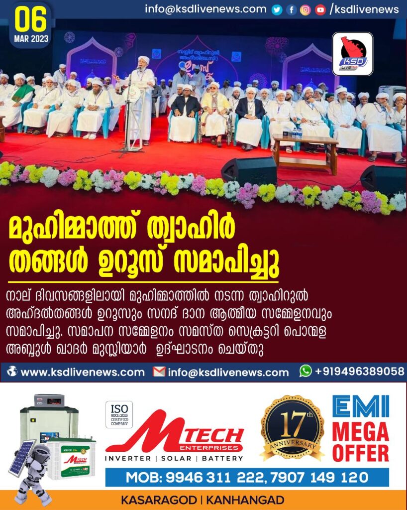 പുത്തിഗെ : നാല് ദിവസങ്ങളിലായി മുഹിമ്മാത്തിൽ നടന്ന ത്വാഹിറുൽ അഹ്ദൽ തങ്ങൾ ഉറൂസും സനദ് ദാന ആത്മീയ സമ്മേളനവും സമാപിച്ചു. സമാപന സമ്മേളനം സമസ്ത സെക്രട്ടറി പൊന്മള അബ്ദുൾ ഖാദർ മുസ്ലിയാർ ഉദ്ഘാടനംചെയ്തു. മുഹിമ്മാത്ത് സീനിയർ ഉപാധ്യക്ഷൻ ഹസനുൽ അഹ്ദൽ തങ്ങൾ അധ്യക്ഷനായി. മുഹിമ്മാത്തിൽനിന്ന് പഠനം പൂർത്തിയാക്കിയ 63 ഹിമമി പണ്ഡിതരും നാല് ഹാഫിളീങ്ങളും (ഖുർആൻ മനഃപാഠമാക്കിയവർ) സനദ് ഏറ്റുവാങ്ങി. സമസ്ത പ്രസിഡന്റ് ഇ. സുലൈമാമൻ മുസ്ലിയാർ ഒതുക്കുങ്ങൽ സനദ് ദാനം നടത്തി. അലി ബാഫഖി തങ്ങൾ, ബി.എസ്. അബ്ദുള്ളക്കുഞ്ഞി ഫൈസി, ഉമർ സഖാഫി, സി.മുഹമ്മദ് ഫൈസി, പേരോട് അബ്ദുൾ റഹ്മാൻ സഖാഫി, അബ്ദുൾറഹ്മാൻ ദാരിമി, എ.പി. അബ്ദുൾ ഹകീം അസ്ഹരി, പള്ളങ്കോട് അബ്ദുൾ ഖാദർ മദനി, ഇബ്രാഹിം അൽ ഹാദി തങ്ങൾ എന്നിവർ സംസാരിച്ചു.”