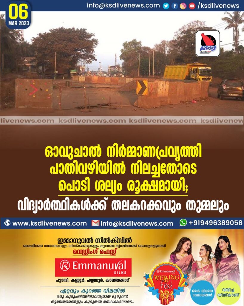 “കുമ്പള: ഓവുചാല് നിര്മ്മാണപ്രവൃത്തി പാതി വഴിയില് നിര്ത്തിവെച്ചതോടെ പരിസരങ്ങളില് പൊടി ശല്യം രൂക്ഷമായി. വിദ്യാര്ത്ഥികള്ക്ക് തലകറക്കവും തുമ്മലും വ്യാപകമാകുന്നു. കുമ്പള-മുള്ളേരിയ റോഡിന്റെ നിര്മ്മണ പ്രവൃത്തിയുടെ ഭാഗമായാണ് അനില് കുമ്പളെ റോഡിന്റെ സമീപം ഓവുചാല് നിര്മ്മിക്കുന്നതിനായി നേരത്തെയുണ്ടായിരുന്ന ടാര് റോഡ് കിളച്ചിരിക്കുന്നത്. റോഡ് അടിച്ചിട്ട് പകരം മറ്റൊരു റോഡ് ഒരുക്കിയിട്ടുണ്ട്. എന്നാല് ഈ റോഡില് കൂടി വാഹനങ്ങള് കടന്ന് പോകുമ്പോള് പൊടി ശല്യം രൂക്ഷമാകുകയാണ്. സമീപത്തായി രണ്ട് സ്കൂളുകളും രണ്ട് സ്വകാര്യ ആസ്പത്രികളും പ്രവര്ത്തിക്കുന്നുണ്ട്. എന്നാല് പൊടി പാറി ക്ലാസ് മുറികളിലേക്കും എത്തുകയാണ്. കുമ്പള ഗവ. ഹയര് സെക്കണ്ടറി സ്കൂളിലെ ഭൂരിഭാഗം വിദ്യാര്ത്ഥികളും കുമ്പള ഗവ.ആസ്പത്രിക്ക് പോകുന്ന രോഗികളും അടക്കമുള്ളവര് നടന്ന് പോകുന്നത് ഇത് വഴിയാണ്. പൊടി ശല്യം കാരണം വിദ്യാര്ത്ഥികള്ക്ക് തലക്കറക്കവും തുമ്മലും പിടിപെടുന്നതായി പറയുന്നു. ഒരു മാസം മുമ്പാണ് ഓവു ചാല് പ്രവൃത്തിക്കായി കുഴിയെടുത്തത്. പത്ത് ദിവസം മാത്രമാണ് പ്രവൃത്തി പണി നടന്നത്. പിന്നീട് പണി നിര്ത്തിയ മട്ടാണ്. നിലവിലെ ടാര് റോഡ് പൊളിക്കുമ്പോള് പുതുതായി നിര്മിക്കുന്ന റോഡിന് ടാര് ചെയ്യണമെന്നത് കരാറുകാരന് നടപ്പാക്കിയില്ലെന്ന് നാട്ടുകാര് പറയുന്നു”