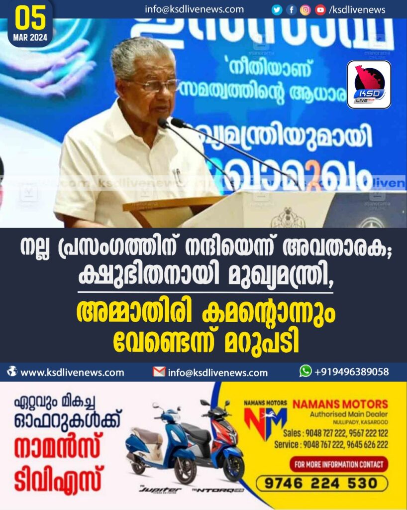 നല്ല പ്രസംഗത്തിന് നന്ദിയെന്ന് അവതാരക; ക്ഷുഭിതനായി മുഖ്യമന്ത്രി, അമ്മാതിരി കമന്റൊന്നും വേണ്ടെന്ന് മറുപടി