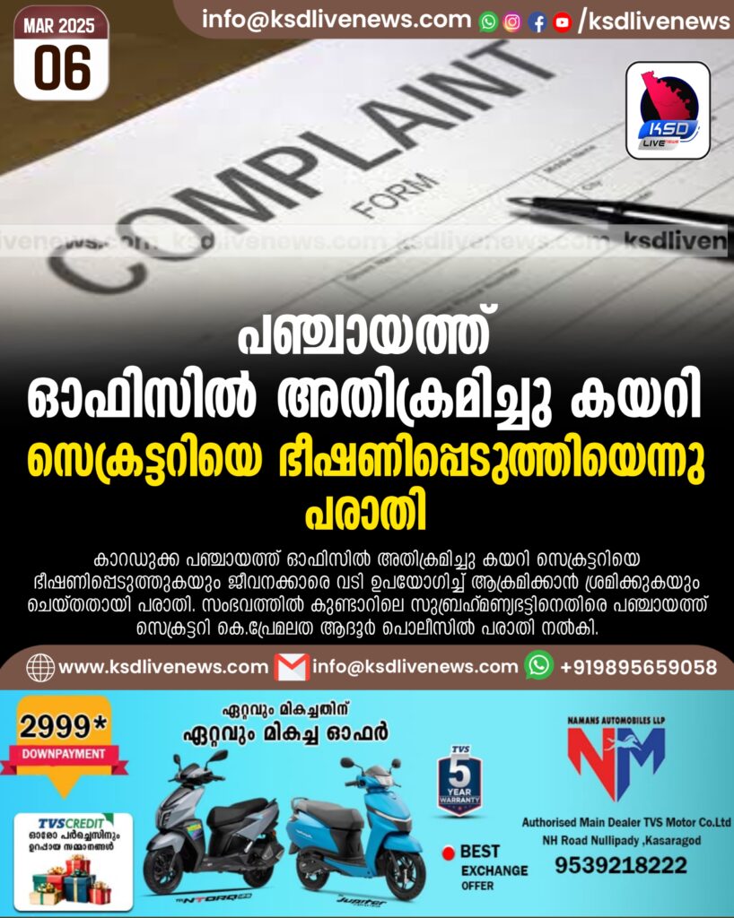 പഞ്ചായത്ത് ഓഫിസിൽ അതിക്രമിച്ചു കയറി സെക്രട്ടറിയെ ഭീഷണിപ്പെടുത്തിയെന്നു പരാതി