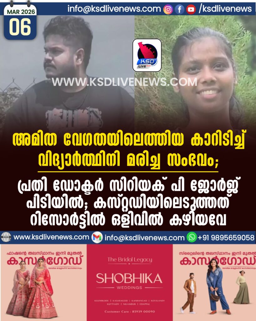 അമിത വേഗതയിലെത്തിയ കാറിടിച്ച് വിദ്യാർത്ഥിനി മരിച്ച സംഭവം; പ്രതി ഡോക്ടർ സിറിയക് പി ജോർജ് പിടിയിൽ; കസ്റ്റഡിയിലെടുത്തത് റിസോര്ട്ടില് ഒളിവില് കഴിയവേ
