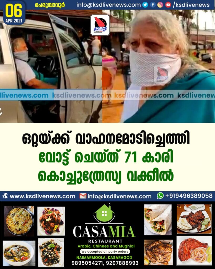 ഒറ്റയ്ക്ക് വാഹനമോടിച്ചെത്തി വോട്ട് ചെയ്ത് 71-കാരി കൊച്ചുത്രേസ്യ വക്കീല്