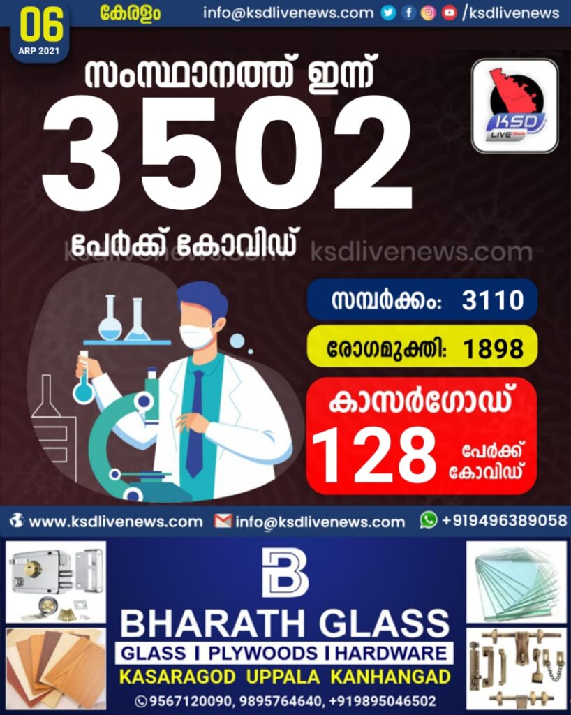 സംസ്ഥാനത്ത് ഇന്ന് 3502 പേർക്ക് കോവിഡ് സ്ഥിരീകരിച്ചു. സമ്പർക്കം വഴി 3110 പേർക്കും ; ആശ്വാസമായി 1898 പേർക്ക് രോഗ മുക്തിയും ; കാസർഗോഡ് ജില്ലയിൽ 128 പേർക്ക് പുതിയ കോവിഡ് കേസുകൾ ; മരണം 14