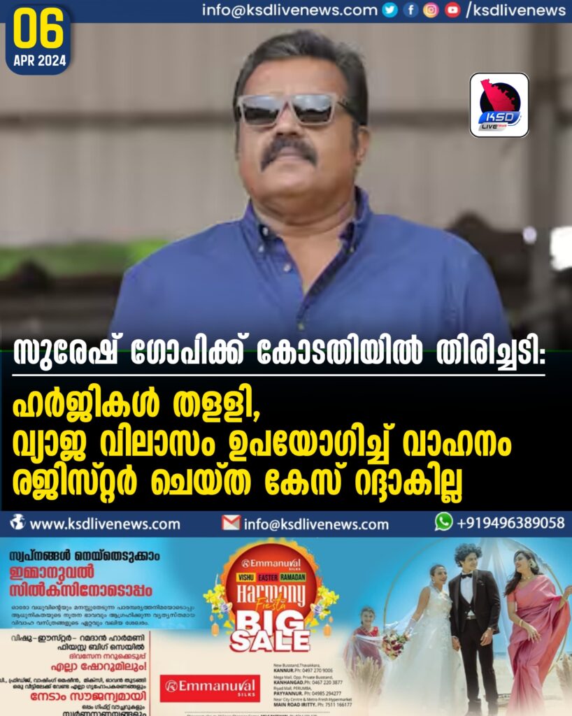സുരേഷ് ഗോപിക്ക് കോടതിയിൽ തിരിച്ചടി, ഹർജികൾ തളളി, വ്യാജ വിലാസം ഉപയോഗിച്ച് വാഹനം രജിസ്റ്റർ ചെയ്ത കേസ് റദ്ദാകില്ല