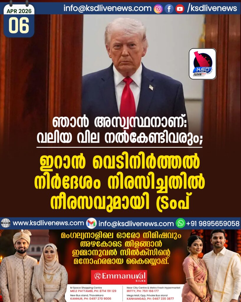 ഇറാന്റെ ഈ നിലപാടിൽ താൻ വളരെ അസ്വസ്ഥനാണെന്നും എത്രയും വേഗം ഒരു കരാറിൽ എത്തിച്ചേരാൻ സാധിക്കാത്ത പക്ഷം ഇറാൻ വലിയ വില നൽകേണ്ടി വരുമെന്നും ട്രംപ് തിങ്കളാഴ്ച മുന്നറിയിപ്പ് നൽകി. ആഗോള ഇന്ധന വിതരണത്തെ ബാധിക്കുന്ന ഹോർമുസ് കടലിടുക്കിലെ ഗതാഗതം പുനഃസ്ഥാപിക്കുന്നതിനും സമാധാന കരാറിൽ എത്തുന്നതിനുമായി ട്രംപ് തന്നെ പ്രഖ്യാപിച്ചിട്ടുള്ള സമയപരിധി അടുത്തവരികയാണ്.