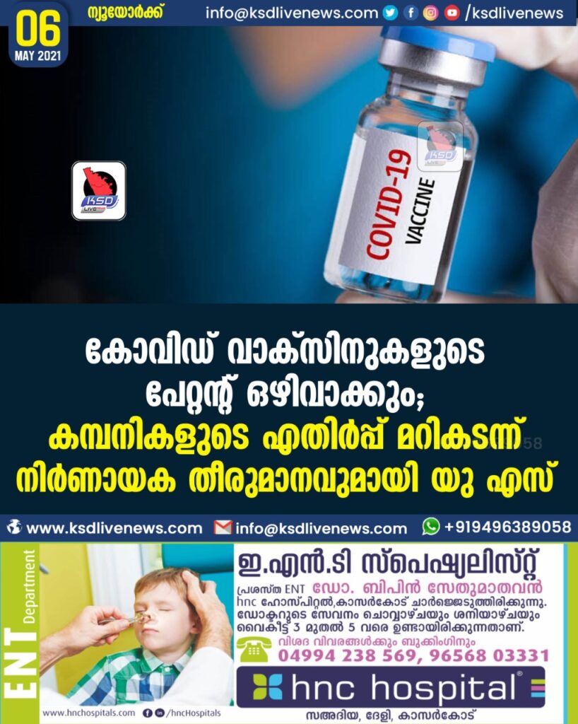 കോവിഡ് വാക്സിനുകളുടെ പേറ്റന്റ് ഒഴിവാക്കും; കമ്പനികളുടെ എതിര്പ്പ് മറികടന്ന് നിര്ണായക തീരുമാനവുമായി യു എസ്