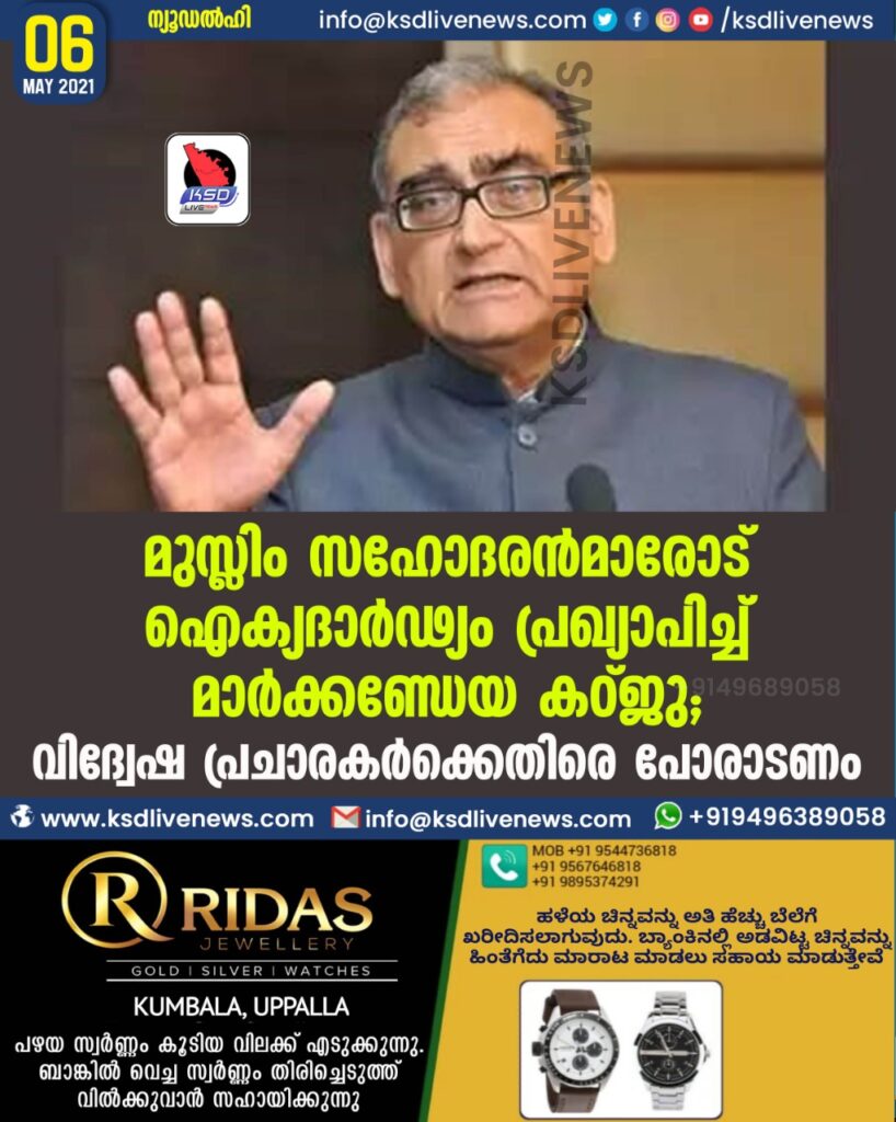 മുസ്ലിം സഹോദരന്‍മാരോട് ഐക്യദാര്‍ഢ്യം പ്രഖ്യാപിച്ച് മാര്‍ക്കണ്ഡേയ കഠ്ജു, വിദ്വേഷ പ്രചാരകര്‍ക്കെതിരെ പോരാടണം