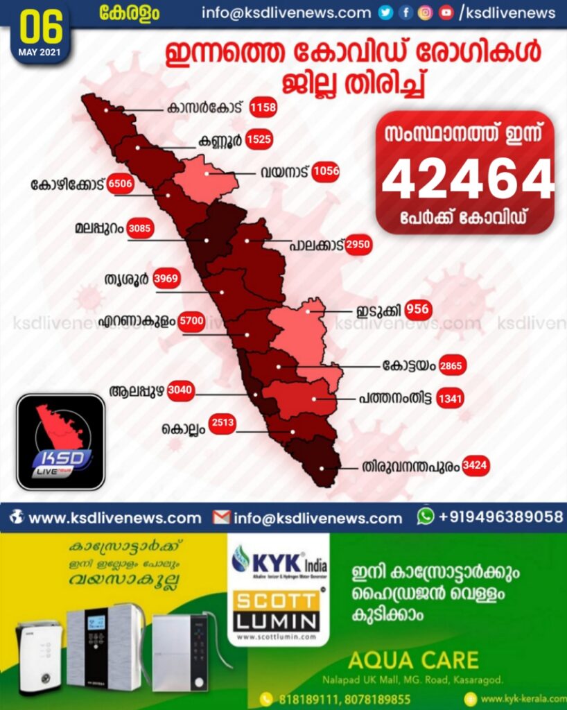 കേരളത്തിൽ ഇന്ന് 42,464 പേർക്ക് കോവിഡ്-19 സ്ഥിരീകരിച്ചു. എറണാകുളം 6506, കോഴിക്കോട് 5700, മലപ്പുറം 4405, തിരുവനന്തപുരം 3969, തൃശൂർ 3587, ആലപ്പുഴ 3040, പാലക്കാട് 2950, കോട്ടയം 2865, കൊല്ലം 2513, കണ്ണൂർ 2418, പത്തനംതിട്ട 1341, കാസർഗോഡ് 1158, വയനാട് 1056, ഇടുക്കി 956 എന്നിങ്ങനേയാണ് ജില്ലകളിൽ ഇന്ന് രോഗ ബാധ സ്ഥിരീകരിച്ചത്.