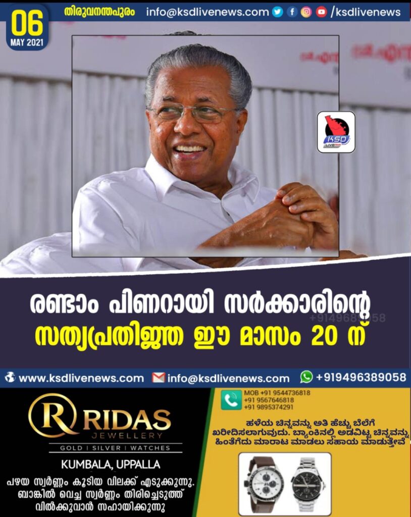 രണ്ടാം പിണറായി സര്ക്കാരിന്റെ സത്യപ്രതിജ്ഞ ഈ മാസം 20 ന്