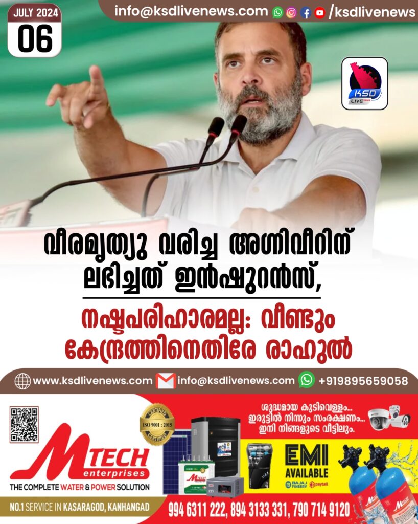 വീരമൃത്യു വരിച്ച അഗ്നിവീറിന് ലഭിച്ചത് ഇൻഷുറൻസ്, നഷ്ടപരിഹാരമല്ല: വീണ്ടും കേന്ദ്രത്തിനെതിരേ രാഹുൽ