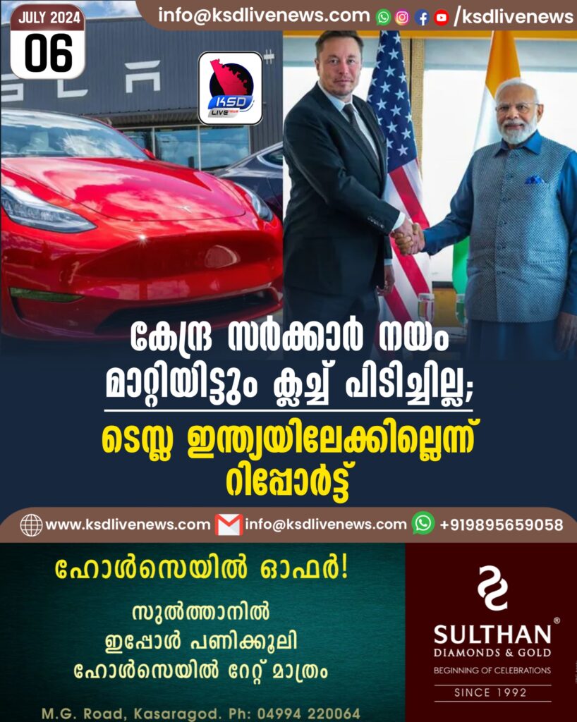 വൈദ്യുതവാഹനരംഗത്ത് ചൈനീസ് കമ്പനികളുമായുള്ള മത്സരത്തില് തിരിച്ചടി നേരിടുന്ന കമ്പനി ഇന്ത്യയില് ഇപ്പോള് നിക്ഷേപം നടത്താന് സന്നദ്ധമല്ലെന്നാണ് റിപ്പോര്ട്ട്. തുടര്ച്ചയായ രണ്ടാംപാദത്തിലും ടെസ്ലയുടെ വില്പ്പനയില് വലിയ കുറവുണ്ടായ സാഹചര്യത്തില്കൂടിയാണിത്. ടെസ്ലയ്ക്ക് പുതിയ നിക്ഷേപം നടത്തുന്നതിന് പരിമിതികള് ഉണ്ടെന്നും അതുകൊണ്ട് ഇന്ത്യയില് നിക്ഷേപം നടത്തുന്ന നീക്കത്തില് ഉറപ്പിലെന്നുമാണ് സൂചനകള്.