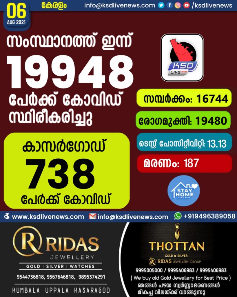 സംസ്ഥാനത്ത് ഇന്ന് 19948 പേർക്ക് കോവിഡ് സ്ഥിരീകരിച്ചു. സമ്പർക്കം വഴി 16744 പേർക്കും ; ആശ്വാസമായി 19480 പേർക്ക് രോഗ മുക്തിയും ; കാസർഗോഡ് ജില്ലയിൽ 738 പേർക്ക് പുതിയ കോവിഡ് കേസുകൾ ; മരണം 187