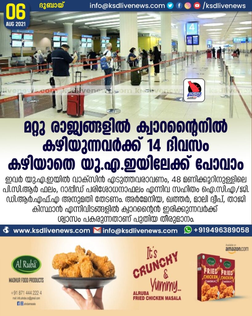 ഇവര് യു.എ.ഇയില് വാക്സിന് എടുത്തവരാവണം, 48 മണിക്കൂറിനുള്ളിലെ പി.സി.ആര് ഫലം, റാപ്പിഡ് പരിശോധനാഫലം എന്നിവ സഹിതം ഐ.സി.എ/ജി.ഡി.ആര്.എഫ്.എ അനുമതി തേടണം. അര്മേനിയ, ഖത്തര്, മാലി ദ്വീപ്, താജികിസ്ഥാന് എന്നിവിടങ്ങളില് ക്വാറന്റൈന് ഇരിക്കുന്നവര്ക്ക് ആശ്വാസം പകരുന്നതാണ് പുതിയ തീരുമാനം.