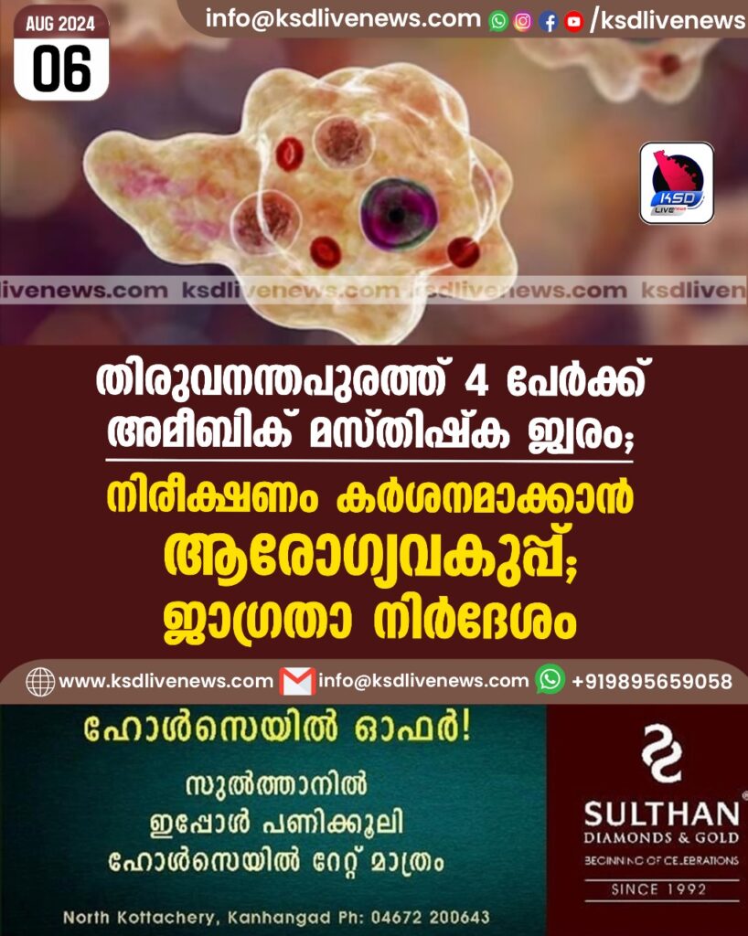 തിരുവനന്തപുരത്ത് 4 പേര്ക്ക് അമീബിക് മസ്തിഷ്ക ജ്വരം; നിരീക്ഷണം കര്ശനമാക്കാൻ ആരോഗ്യവകുപ്പ്; ജാഗ്രതാനിര്ദേശം