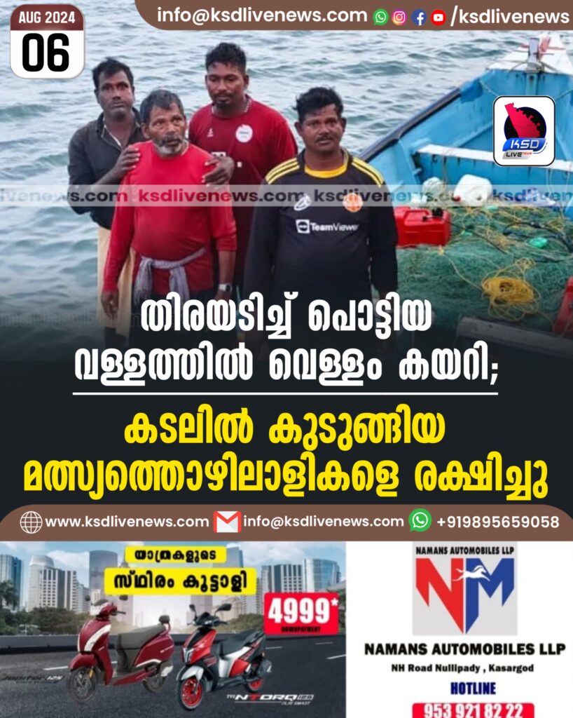 തിരയടിച്ച് പൊട്ടിയ വള്ളത്തില് വെള്ളം കയറി; കടലില് കുടുങ്ങിയ മത്സ്യത്തൊഴിലാളികളെ രക്ഷിച്ചു