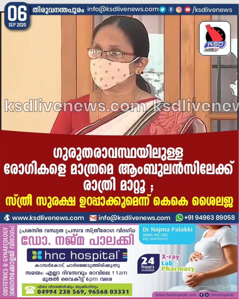 ഗുരുതരാവസ്ഥയിലുള്ള രോഗികളെ മാത്രമെ ആംബുലൻസിലേക്ക് രാത്രി മാറ്റൂ ; സ്ത്രീ സുരക്ഷ ഉറപ്പാക്കുമെന്ന് കെകെ ശൈലജ