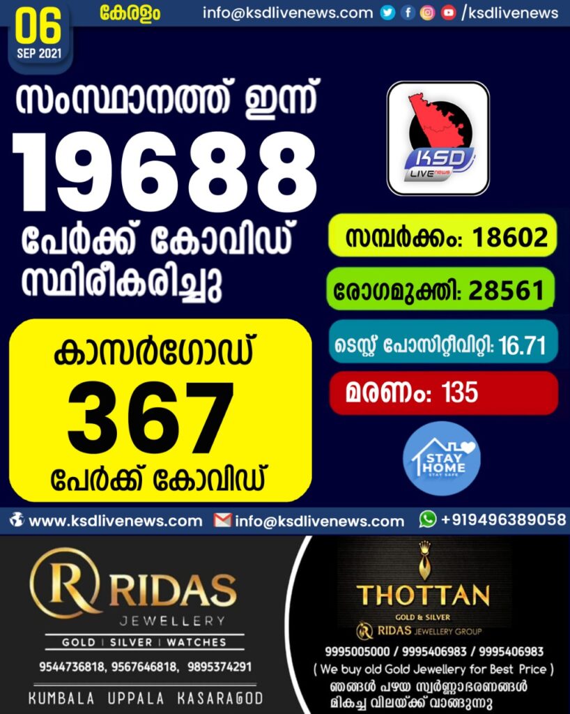 സംസ്ഥാനത്ത് ഇന്ന് 19,688 പേർക്ക് കോവിഡ് സ്ഥിരീകരിച്ചു. സമ്പർക്കം വഴി 18602 പേർക്കും ; ആശ്വാസമായി 28,561 പേർക്ക് രോഗ മുക്തിയും ; കാസർഗോഡ് ജില്ലയിൽ 367 പേർക്ക് പുതിയ കോവിഡ് കേസുകൾ ; മരണം 135