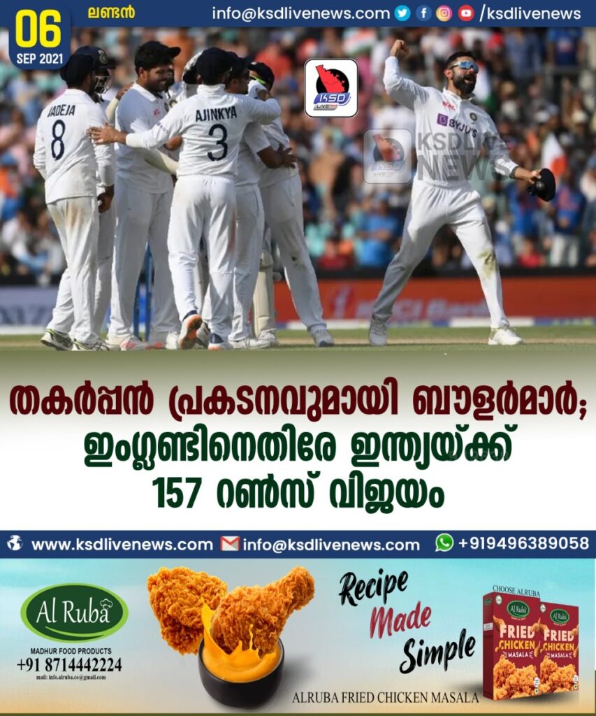തകര്‍പ്പന്‍ പ്രകടനവുമായി ബൗളര്‍മാര്‍, ഇംഗ്ലണ്ടിനെതിരേ ഇന്ത്യയ്ക്ക് 157 റണ്‍സ് വിജയം