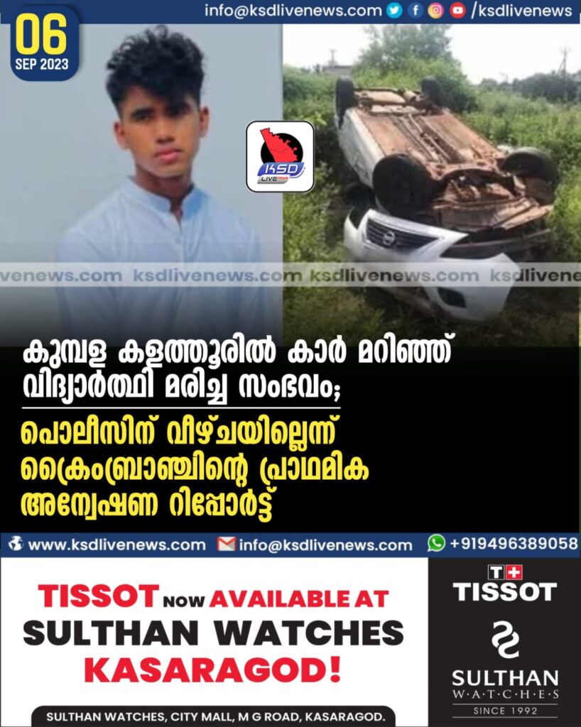 കുമ്പള കളത്തൂരിൽ കാർ മറിഞ്ഞ് വിദ്യാർത്ഥി മരിച്ച സംഭവം; പൊലീസിന് വീഴ്ചയില്ലെന്ന് ക്രൈംബ്രാഞ്ചിന്റെ പ്രാഥമിക അന്വേഷണ റിപ്പോർട്ട്