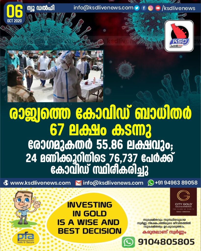 രാജ്യത്തെ കോവിഡ് ബാധിതർ 67 ലക്ഷം കടന്നു ; രോഗമുകതർ 55.86 ലക്ഷവും ;