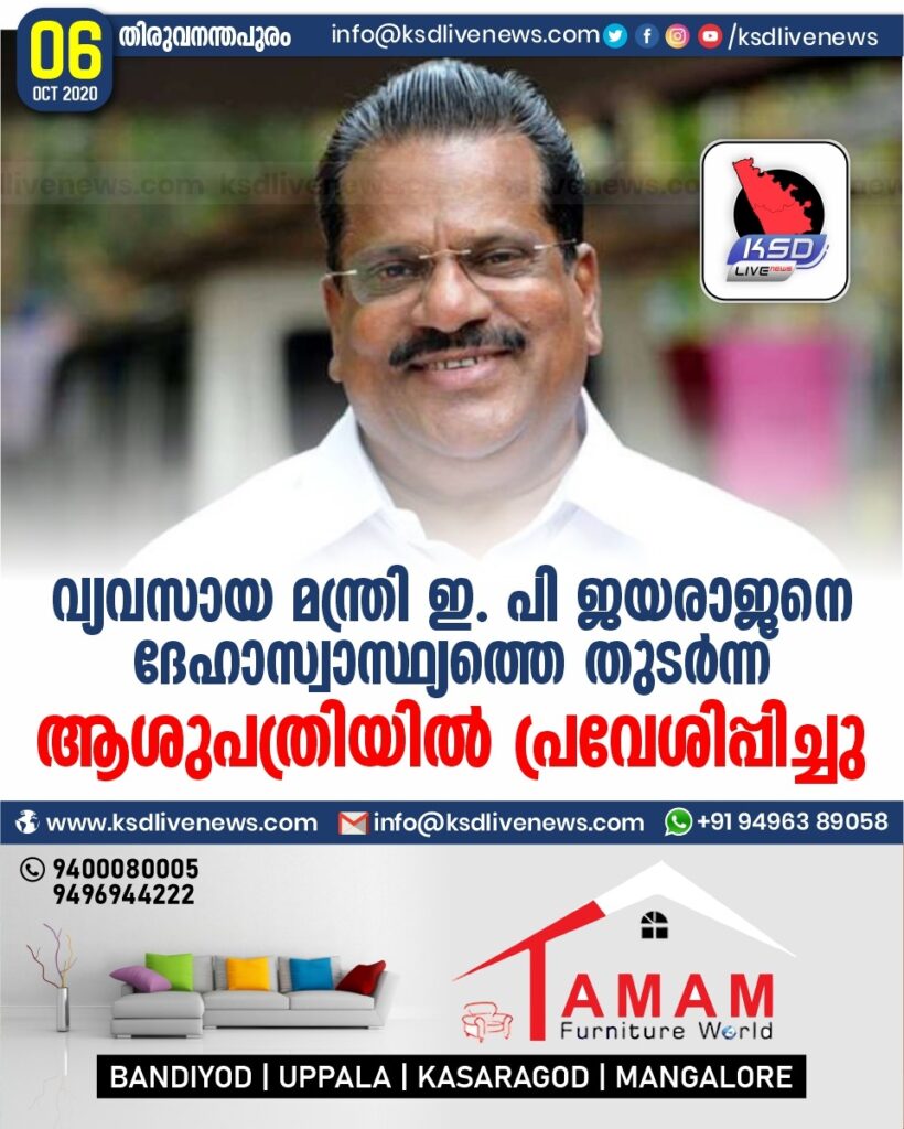 വ്യവസായ മന്ത്രി ഇ. പി ജയരാജനെ ദേഹാസ്വാസ്ഥ്യത്തെ തുടര്ന്ന് ആശുപത്രിയിൽ പ്രവേശിപ്പിച്ചു
