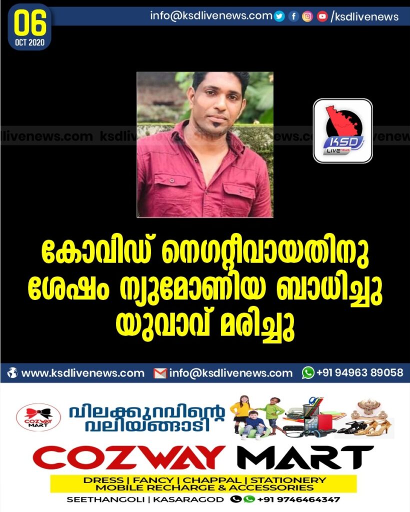 കോവിഡ് നെഗറ്റീവായതിനു ശേഷം ന്യുമോണിയ ബാധിച്ചു യുവാവ് മരിച്ചു