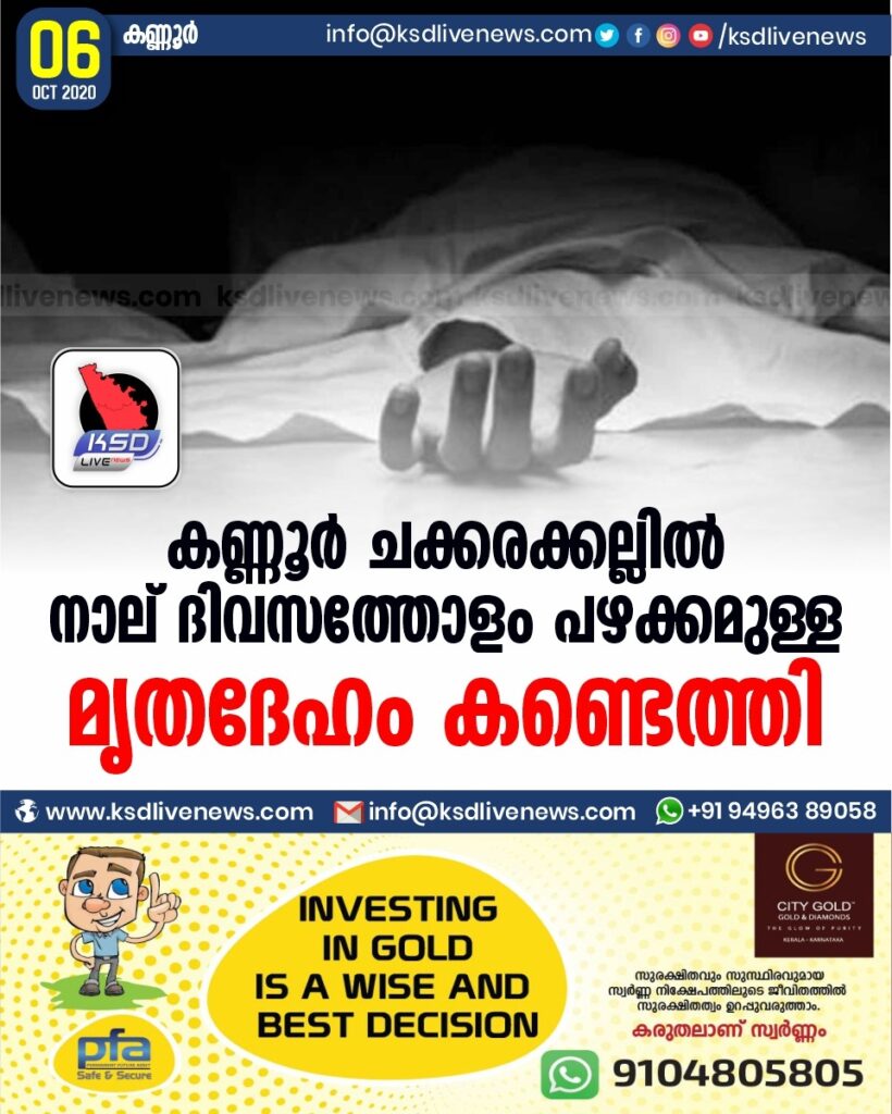 കണ്ണൂർ ചക്കരക്കല്ലിൽ നാല് ദിവസത്തോളം പഴക്കമുള്ള മൃതദേഹം കണ്ടെത്തി